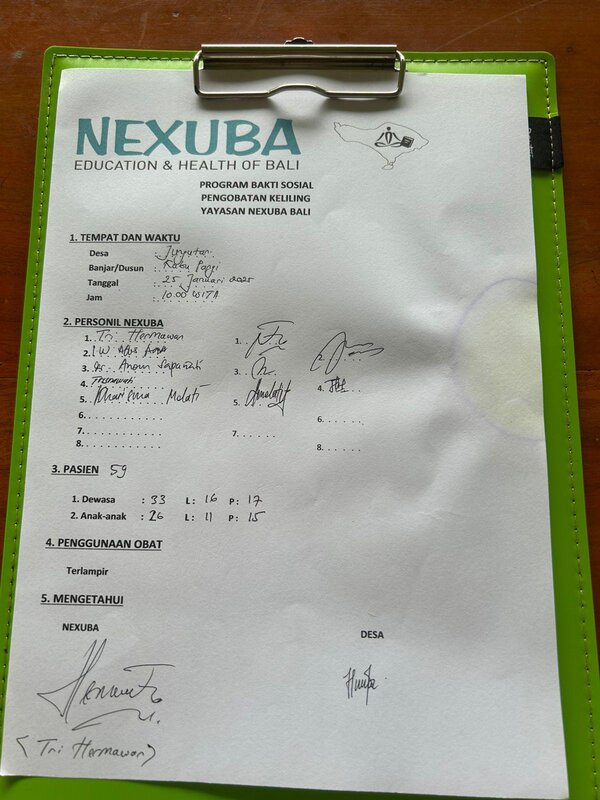 On January 25, 2025, Nexuba conducted a mobile medical relief mission in the village of Jungutan (Banjar Kaja Pagi). A total of 59 patients were treated, including 33 adults and 26 children. The medical team documented the operation, including the administered medications. The mission was officially confirmed by Nexuba and a village representative.