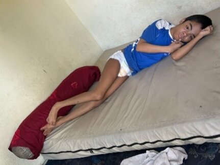 Die in sehr armen Verhältnissen lebenden Eltern von Heri sind stark gefordert mit der Rund-um-die-Uhr-Pflege ihres einzigen Kindes. Durch unsere Unterstützung können sie nun aber sicher sein, über die notwendigen Hygieneartikel zu verfügen und die Besuche der Pflegefachfrauen motivieren sie immer wieder für ihre schwierige Aufgabe. Eine geeignete neue Matratze erleichtert dem Jungen das Liegen, und auch er freut sich immer über die NEXUBA-Besuche. Die Eltern bemühen sich beeindruckend, dem Kind das Leben lebenswert zu machen.